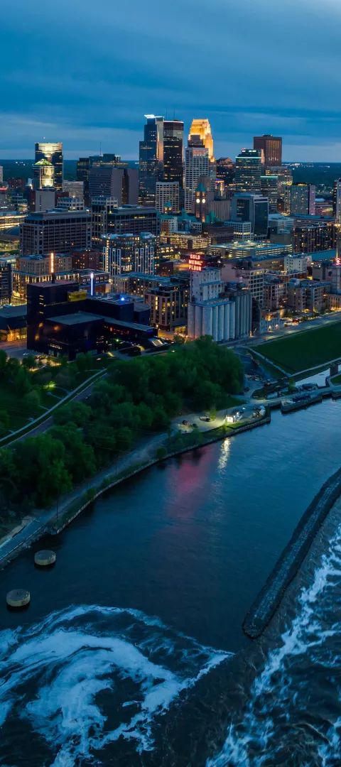 Minneapolis' skyline shines along the Mississippi River